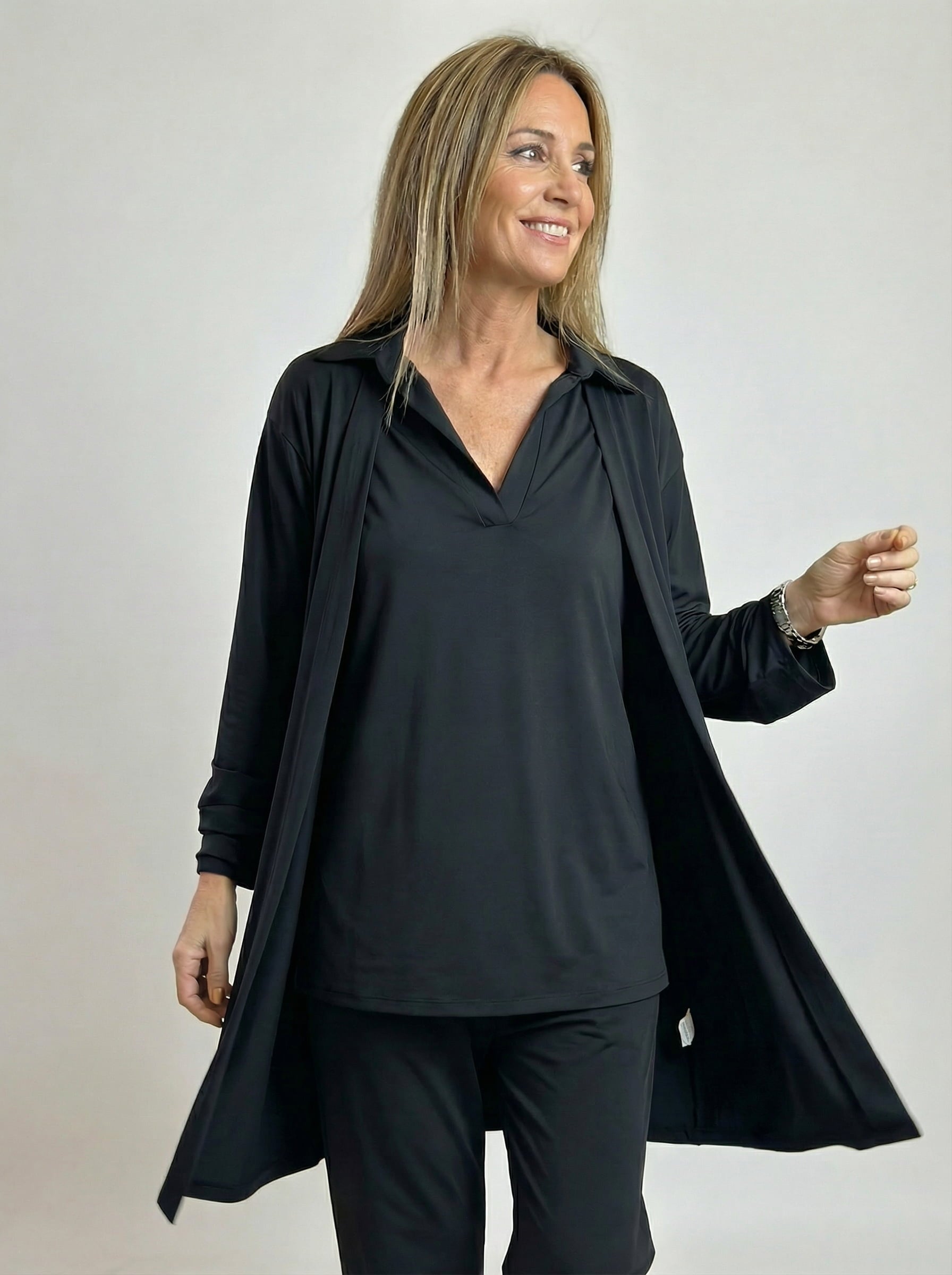 El largo es perfecto para tapar justo lo que queremos — cadera, barriguita — pero sin parecer ancho ni pesado. Te la puedes poner suelta o meter un poquito por dentro si quieres marcar algo más la figura.